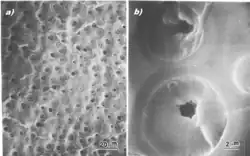 Cavitation is common in epoxy resins and other craze resistant toughened polymers, and is prerequisite to shearing in Izod impact strength testing.[10] During the deformation and fracture of a toughened polymer, cavitation of the strained rubber particles occurs in crazing-prone and non-crazing-prone plastics, including, ABS, PVC, nylon, high impact polystyrene, and CTBN toughened epoxies. Engineers use an energy-balance approach to model how particle size and rubber modulus factors influence material toughness. Both particle size and modulus show positive correlation with brittle-tough transition temperatures. They are both shown to affect the cavitation process occurring at the crack tip process zone early in deformation, preceding large-scale crazing and shear yielding.[10][11]