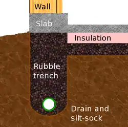 The rubble trench foundation, an ancient construction approach popularized by architect Frank Lloyd Wright, is a type of foundation that uses loose stone or rubble to minimize the use of concrete and improve drainage.[1] It is considered more environmentally friendly than other types of foundation because cement manufacturing requires the use of enormous amounts of energy. However, some soil environments are not suitable for this kind of foundation, particularly expansive or poor load-bearing (< ~100 kN/m² or 1 ton/sf) soils.[2] A rubble trench foundation with a concrete grade beam is not recommended for earthquake prone areas.[3]