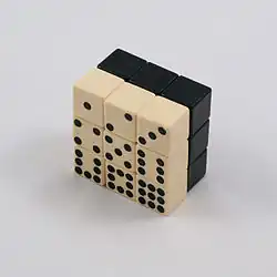 Rubik's Domino is a hand-held puzzle similar to a Rubik's Cube. However, it has one layer removed, making it a 2×3×3 cuboid. The 3×3 faces can be turned 90-degrees as normal, but the 2×3 faces can only be turned 180 degrees. Other cuboids of 2×2×n (if n is an even number) will solve like multiple dominoes at once. When only using pairs of turns, the puzzle may be solved similarly to a 3x3. The original version had white and black plastic layers. Each 3×3 face displayed a number of dots from 1–9. More recent versions use the traditional six-colour scheme, as seen on most other twisty puzzles. It has 406,425,600 potential positions and any position can be made into a solved position in 19 moves.[1] It was registered as US Patent number 4378116 on 29 March 1983 by Ernő Rubik.[2]