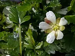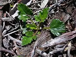 Rubus gunnianus is the smallest of all the species in the family Rosaceae. It grows as a small, prostrate herb in alpine habitats throughout Tasmania. When mature, the plant can spread by sending out runners[5] to make the plant larger, as well as by setting seed. Unlike other species of the genus Rubus, this species does not have any thorns or spines. The leaves grow out from the stem as a florette, and are triangular and glossy green. The palmately compound leaves are composed of three pinnatipartite leaflets (one main one flanked by two smaller ones either side), with very long petioles.