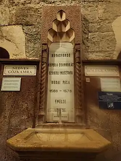 The baths were commissioned by Sokollu Mustafa Pasha who was the governor (beylerbey) of Buda between 1566 and 1578.[1] This is inscribed in Hungarian in the baths, on a stone standing atop the Juve spring, which is believed by locals to have a rejuvenating effect on people. As Sokollu Mustafa Pasha was the nephew of Grand Vizier Sokollu Mehmed Pasha, Rudas baths echoes the design and dimensions of similar monumental Ottoman constructions in Istanbul.[3]