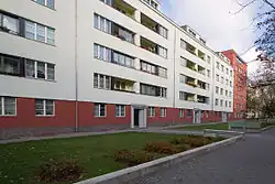 In 1924 he opened his own office in Berlin, and in 1925 he became a member of the Deutscher Werkbund. His first large commission was the Gartenstadt Atlantic, a moderate-income housing development in Gesundbrunnen, which has been a protected landmark since 1995. The buildings were unusually brightly coloured even for modernist housing of the period: the ground floor was violet, the upper floors pale green, the entrances grey and the balcony strips yellow. This detail has not been preserved;[6] colours were updated as part of the 2001-05 renovation.[7] In 1927, the development won the Werkbund's first prize for best housing development for inverting the concept of the garden city into an inner-city development with internal parks, and for the holistic lifestyle made possible by the central location.[7] The first portion of the development to be completed was the Lichtburg cinema[8] and its associated commercial building housing restaurants, meeting and banquet facilities, shops and a bowling alley, next to the S- and U-Bahn station. The cinema was one of the first with sound; the building as a whole won praise for its modernity and for the use of space. He went on to design other residential buildings, housing developments and places of amusement in Berlin and environs, including a block of 400 flats finished in yellow stucco over a brown brick ground floor facing the Schöneberg city park.[9]
