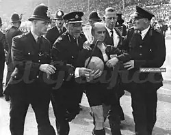 ![]() Kreitlein (holding the ball) retires from the pitch escorted by the police, after the controversial England v Argentina match in 1966 | |||
