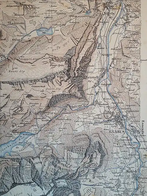 Rudolf Leuzinger (Netstal, December 17, 1826 - Mollis, January 11, 1896) was a Swiss cartographer. He is known as one of the most prolific cartographers in Switzerland and one of the best interpreters of mountain landscapes and geologic forms. Leuzinger was also the first to produce terrain maps in color lithography. His more than 300 maps are a rare combination of accuracy, scientific thoroughness and artistry and earned him several national and international honors. [1]