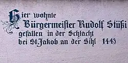 He died at the Battle of St. Jakob an der Sihl, defending the bridge over the Sihl while covering the retreat of the army of Zürich. According to chroniclers, he was killed by a confederate hiding below the bridge. Another version of the story has Stüssi stopping in the middle of the bridge, brandishing his broad battle-axe and shouting, "Halt, citizens, halt!" To this a man of Zurich cried, "May God's lightning blast thee! All this evil comes from thee alone," and ran him through with his lance.[1]