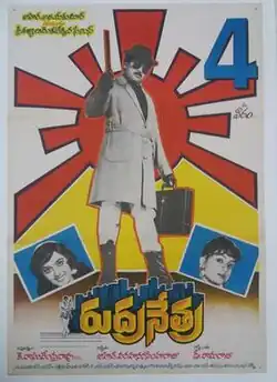 Rudranetra is a 1989 Telugu-language spy film directed by K. Raghavendra Rao.[1][2] The film was written by Yandamuri Veerendranath and stars Chiranjeevi, Vijayashanti, Radha, and Rao Gopal Rao. The film was dubbed into Hindi as Secret Agent Raja. The soundtrack, composed by Ilaiyaraaja, was a hit. The film is based on conspiracy theories and was a box office hit.[3]
