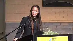 From 2017 to 2021, Rue Simmons served as the alderman of the 5th Ward. As alderman, she led the passage of the United States' first government-funded reparations legislation.[2][3][4][5] The local reparations initiative[6] is being funded by the first $10 million of adult-use cannabis sales tax revenue collected by the City of Evanston.[7] The first stage of the reparations program is focused on homeownership. After leaving office,[8] Rue Simmons now serves as the chair of the City of Evanston's Reparations Committee.