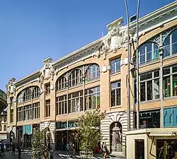 The building is characteristic of constructions from the beginning of the 20th century, with an exposed cast-iron architecture and light brick filling. Georges Debrie, however, respects the forms of Toulouse neoclassical architecture, with an alternation of narrow rectangular openings and wider basket-handle openings. The elevation is thus punctuated by the bays of the doors, highlighted on the ground floor and the mezzanine by the brick bossing and crowned by large medallions sculpted in stone, surrounded by garlands of flowers and leaves and masks. The three large metal basket-handle arches join the intermediate bays. They are intersected by cast iron columns. The elevation is crowned by a broken cornice with modillions. Inside, the architect uses the possibilities offered by the metal architecture to free up a vast central space, covered by a glass dome, which illuminates the heart of the building. The double ramp staircase provides access to the upper levels. An elevator was added, then an escalator, the first in the city when it was installed.[10][11]