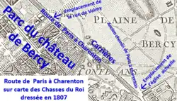 The layout of the street from Porte de Charenton to the center of Charenton (Place Aristide-Briand) dates back to 1690 when Anne Louis de Malon, owner of the Château and park of Bercy, obtained permission from Louvois, the superintendent of buildings, arts, and manufactures of France, to move the Paris-to-Charenton road 30 toises (approximately 60 meters) north of the château and build a new road at his own expense.[3] The original road was a straight line extending from the intersection of Rue Charenton in Paris and Rue Nicolaï, continuing to the junction of Rue Winston-Churchill and Avenue de la Liberté, following the current route of Rue de Conflans.[12][9] The road crossed the large park of the château, designed south of Rue Charenton by Le Nôtre. The larger part of the park (to the west of Avenue de la Liberté) became part of the commune of Bercy in 1790. This area, part of the former commune dissolved in 1860, was divided between Charenton and Paris. Beyond the park, towards Place de l'Église, the road passed through the Bercy plain, which consisted of gardens, wastelands, quarries, and old quarries.