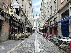 The Rue des Marronniers (French pronunciation: [ʁy de maʁɔnje]) is a street located in the Bellecour quarter, in the 2nd arrondissement of Lyon. It is a small paved pedestrian street famous for its many bouchons. It is served by the metro station Bellecour and many buses. The street belongs to a zone classified as a World Heritage Site by UNESCO.