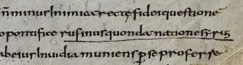 The Syrian Rufinus is usually identified with the Rufinus who wrote the Liber de fide (Book of Faith), which survives in a single manuscript, now MS Q. v. 1. 6 in the Saint Petersburg Public Library. The manuscript describes the author as a priest from the province of Palestine. In this work Rufinus attacks Arianism, Origenism and the doctrine of original sin. The work was for a long time ascribed erroneously to Tyrannius Rufinus.[1] The latter, also called Rufinus of Aquileia, was definitely a different person.[2]