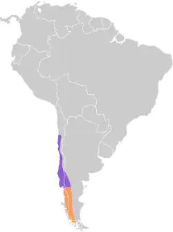 The rufous-tailed plantcutter is found further south than any other cotinga, inhabiting scrub, forest edge and river valleys in Chile and western Argentina. The range extends from Magallanes region north to Atacama in Chile and from Santa Cruz north to Mendoza in Argentina. Birds breeding in southern or high-altitude regions move northwards or towards the lowlands in winter. It has been recorded as a vagrant to the Falkland Islands. Birds are often seen in gardens, farmland and orchards and are sometimes considered to be a pest. The nest is a cup of root fibres and twigs built in a fork in a shrub or tree. Two to four eggs are laid, they are blue-green with dark spots concentrated at the larger end.
