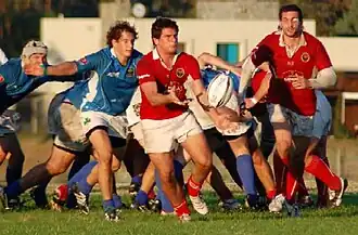 Rugby was being played in neighbouring Argentina and Brazil in the late nineteenth century, mainly by British immigrants, and there is some evidence of this within Uruguay itself. English cricket clubs were the incubators of rugby in South America, although rugby has survived much better in these countries than cricket has.[3] It has been claimed that Montevideo Cricket Club (MVCC) played rugby football as early as 1865,[3] but the first certain match was between Uruguayans and British members of the MVCC in 1880.[3] The MVCC claims to be the oldest rugby club outside Europe.[4] One observer, apparently disdainful of the Britons mixing with the "natives", found the 1880 match to be: