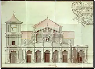 - "The church is very large, made entirely of sandstone, with three half-orange naves, very well painted and gilded, with a magnificent portico and beautiful architecture; the half-orange vaults are made of wood; the high altar is carved without gilding, missing the last part: on the crossing there are three sculpted altars, two in Italian style, also gilded".[24]: 66–67