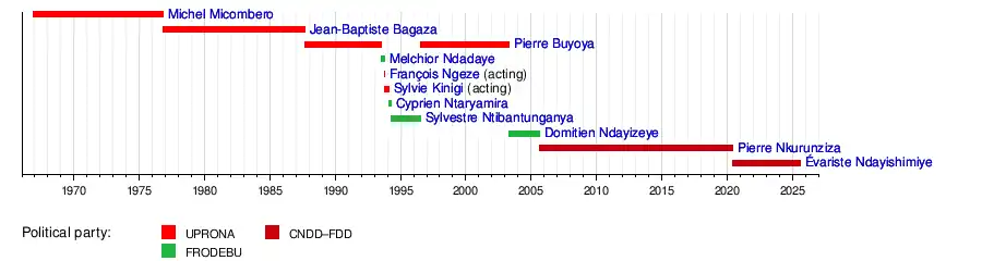 Nine people have served in the office since Burundi became a republic. Only one president, Pierre Buyoya, has served on two non-consecutive occasions.[4] Sylvie Kinigi was the first and only woman who has served in the role (on an interim basis).[5] The current president, Évariste Ndayishimiye, has been serving in the role since 18 June 2020.