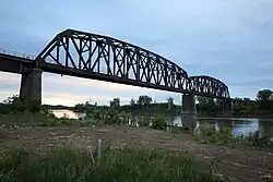 In 1977, the steel truss was replaced in 48 hours when sections of the new bridge were assembled on either side of the river, then lifted onto falsework towers on barges on both sides of the up and downstream sides. The new bridge was placed on the upstream towers and the old bridge was moved to the downstream side and then new bridge was placed on the original 1887 piers.[5] The bridge now has two main spans over the river that are 375 feet (114 m) long.[6]