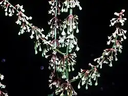 Swamp dock is a perennial plant about 1–1.5 m (3–5 ft) tall with a central stem usually green in color. The leaves of the plant are alternate and about 6 cm (2.5 in) in width and 30 cm (12 in) long. The petioles of the plant become gradually shorter in length from the bottom leaves to the top leaves.[1] The flowers of this plant have green tepals surrounding six stamens, yellow or white, in the center. The flowers have a droopy appearance and extend toward the base of the plant. The blooming period of swamp dock is usually in the summer and is short period of two weeks. The root system is a taproot and this plant is anemophilous.