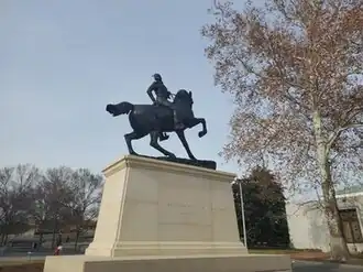 Rumors of War is a series of artworks by Kehinde Wiley examining equestrian portraiture in the canon of Western art history[1] culminating in a bronze monumental equestrian statue by the artist of an African-American young man (with dreadlocks in a ponytail, jeans ripped at the knees and Nike high-top sneakers). The statue was created as a response to the statue of Confederate General J.E.B. Stuart in Richmond, Virginia in particular and similar statues of high-ranking Confederate Army officers, some of which still stand in the United States despite persistent calls for their removal.[2] Since the installation of Rumors of War in Richmond, all of the statues of the military leaders of the Confederacy have been removed from Monument Avenue where they had been since the first decade of the 20th century.