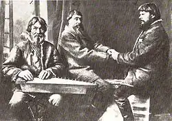 In addition to their musical character, runic singers also are required to follow certain practices as they sang, such as Karelian runic singers holding hands while singing in a call and response fashion. Ingrian runic singing includes additional choralists. Vocal ranges usually correspond with the range of a kantele.[2] The term "runic song" does not include Livonian or Vepsian song, though they are related.[3]