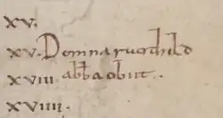 Ruothild's year of death is indicated by a note added in the margin of the manuscript Reg. lat. 141 next to the year 852 in an Easter table.[12] The manuscript was created at Faremoutiers and the note is contemporary.[13] It reads simply Domna ruothild abb[atiss]a obiit ("Lady Ruothild, abbess, died").[14] The necrology of Faremoutiers supplies the day of her death, 24 March, without indicating the year.[15] Ruothild was succeeded as abbess by Bertrada, who was probably Lothar's daughter. She had been a nun at Faremoutiers since the 830s.[16]