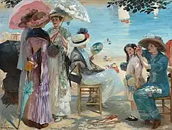 Deborah Edwards, curator of Rupert Bunny: Artist in Paris, said Bunny is "unquestionably the most successful artist we (Australia) had in Paris".[10] He regularly exhibited works in Parisian salons.[3] Incomparable to other expatriates, he had a deep intimacy and familiarity with the Parisian art scene.[14] As Australian art critic John McDonald stated, "It is no exaggeration to say that Bunny had the greatest international reputation of any Australian-born painter".[12] He began exhibiting works in the Salon de la Société des Artistes Français in 1888.[3] Bunny also exhibited in the New Salon, the Old Salon and the Salon D'Automne.[8] He was the first Australian to receive an honourable mention in 1890 at the Salon de la Société des Artistes Français for the painting Tritons (circa 1890).[15] He also exhibited works internationally, including in Australia, America and England.[14] Sea Idlyll, exhibited in the Royal Academy, was bought by Alfred Felton, who gave it to the National Gallery of Victoria in 1892.[3] This was to be the first painting of Bunny's that an Australian gallery obtained.[3]
