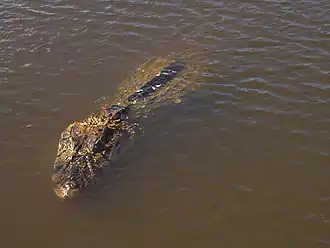 Reptiles thrive in the Rupununi river, preying off of small fish and crustaceans. In another study conducted by the BAT (South Rupununi Biodiversity Assessment Team), it was discovered that 34 different species[5] of reptiles were living along the river. The black caiman is the largest predator in the Rupununi, measuring up to 5 m in length, however it has become endangered due to hunting for their belly skins throughout the 1930s - 1970s.[1]