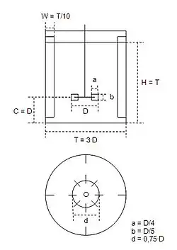 The Rushton turbine or Rushton disc turbine is a radial flow impeller used for many mixing applications (commonly for gas dispersion applications) in process engineering and was invented by John Henry Rushton.[1] The design is based on a flat horizontal disk, with flat, vertically mounted blades.[2] Recent innovations include the use of concave or semi-circular blades.[3]