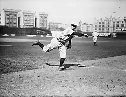Ford pitched for the Highlanders in 1910, and tried to disguise his emery ball as a "slide ball", a type of spitball that could move side-to-side, in addition to up and down.[16] Ford won 26 games against six losses for the Highlanders,[3] and threw complete games in all 26 wins.[17] He also had a 1.65 earned run average (ERA), which was the seventh-best in the American League, and 209 strikeouts, which was the fourth-most.[2][18] Ford also shared the secret of his emery ball with teammates Eddie Foster and Earle Gardner, who he roomed with when the Highlanders were traveling.[12]