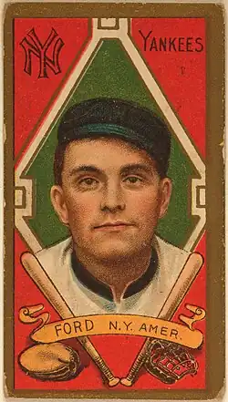 For the 1911 season, the Highlanders paid Ford a $5,500 salary ($185,605 in current dollar terms), second-highest on the team behind only Hal Chase, the first baseman and manager.[19] In 1911, Ford won 22 games and lost 11.[17] He also had a 2.27 ERA, which was the seventh-best in the American League, and 158 strikeouts, which was the fifth-most.[2][20] In 1912, he only won 13 games while losing 21, and his strikeout total decreased to 112.[1][21] His 21 losses, 115 earned runs, and 11 home runs allowed were the most in the American League.[22] Ford had 13 wins, 18 losses, and a 2.66 ERA in the 1913 season, with only 72 strikeouts.[23] During the 1913 season, Ford announced that he was giving up the spitball because of the strain that it put on his shoulder and wrist.[24]