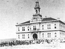 By 1881, the population of William Heath's and Alonzo Horton's New San Diego, swelled to over 2,500 which quickly filled up the exisiting schools and necessitated the construntion of another.[3] Voters then approved $12,000 ($390,993 in 2024) to construct the new school, which came to be named Russ School after lumberman Joseph Russ, who donated the lumber to build the school.[4] The school was built in the Italian Villa style with a low-hip roof, ironwork parapet, and open-bell tower. It consisted of two stories and eight rooms. The school opened on August 14, 1882 to a class of 308 students from grades 1 through 8.[3]