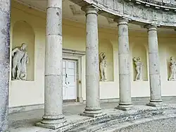 Russborough is a classical Palladian villa made up of a central block containing the principal rooms and two wings housing the servants and stable blocks to the east and west. Castle enhanced his core design with a wealth of features. The Greek orders are observed in the Doric columns of the colonnades and the Corinthian columns that flank the main entrance, supporting a fused portico enriched with swags of flowers. At the bottom of the flight of granite steps the visitor is greeted by a pair of heraldic lions, bearers of the Leeson arms. Russborough's central block contains seven principal rooms on the ground floor with the largest, the Entrance Hall at centre of the south front, and the main reception room, the Saloon placed directly to its north. The other five rooms, originally comprising two Drawing Rooms, two Dining Rooms, and a Music Room complete a symmetrical arrangement. The ceilings of several rooms and the main stairhall feature elaborate stucco work attributed to the Swiss-Italian stuccodores, Paolo and Filippo Lafrancini.