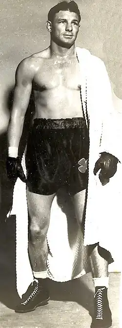 Russell Scott was born on March 27, 1917, in Electra, Texas. He was 5 feet, 11 inches tall and weighed 180 lbs. His boxing record is won 114 (KO 61) + lost 31 (KO 6) and drawn 6 = 151 rounds boxed 1112 KO% 40.4. Russell Scott is the younger brother of lightweight boxer Howard Scott. Most of Russell Scott's losses were at the end of his career. His death came on January 20, 1980, about 28 years after he retired from boxing. He was married three times, first to Geraldine Nichols, and then to Helen Green and last to Betty Brown. Russell had three daughters and one son. He went to George Washington University on an American football scholarship.
