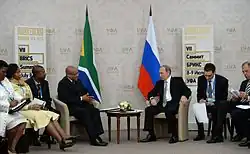 South Africa joined the BRICS group of nations in 2010,[13] a key foreign policy goal of the Zuma administration,[11] with the active support of the Russian Federation.[12] This period also saw a period of closer ties with South Africa's security apparatus as members of South Africa's State Security Agency traveled to Russia for training and the country sought to build its own satellite surveillance capabilities with Russian assistance.[13] During the Zuma administration bilateral agreements on agriculture, arts and culture, defence, education, energy, fisheries, mining, science and technology and transport were signed with Russia.[11] Through his presidency Zuma made a number of medically related trips to Russia to receive treatment for alleged incidents of poisoning.[14][15][16] University of Cape Town academic, Sean Gossel, has stated that bilateral relations between the two countries strengthened the most during the "State Capture years" between 2013 and 2017; thereby linking the growth of relations with the growth of corruption in South Africa.[5]