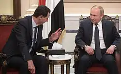 On 30 September 2015, Russia began a military intervention in the Syrian Civil War in support of Bashar al-Assad's government, consisting of air strikes against Syrians who opposed the government. In addition, ISIS and Assad's forces fought against opposition groups (FSA). With Vladimir Putin's support, Assad's troops were fighting the Free Syrian Army throughout the country.[66] Expressing Russian, Iranian, and Syrian support for each other, the Chairman of the Iranian parliament's, (aka Islamic Consultative Assembly or Majlis) National Security and Foreign Policy Committee – Heshmat-Allah Falahat Pishe – stated during an interview on Russia Today TV on 1 February 2019: "Russian, Iranian, and Syrian soldiers shed their blood together in Syria. ... I do now know why the Russians hesitate to say that our relationship is strategic. We have fought together and Russia is under American sanctions, just like us. In order to deal with that, we expect more cooperation from the Russian side."[67]