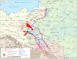 The Russian army, poorly supplied and often poorly commanded, was routed by the great offensives of the Central Powers in 1915: Austro-Hungarians and Germans in Galicia, Germans alone in central Poland. The great Russian fortresses of Ivangorod, Novogeorgievsk, Grodno, Osowiec, and Kovno, surrounded and shelled by German heavy artillery, had to capitulate with their painstakingly replenished ammunition stocks. The "scorched earth" strategy ordered by the Russian general staff led to the destruction of factories, warehouses, and silos, while hundreds of thousands of civilians were evacuated in a panic to the east.[37] The loss of Russian Poland deprived the Empire of 10% of its iron and steel production and 50% of its chemical industry.[38]