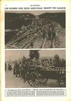 In 1914, the entire army had just 679 motorized vehicles, and most transport was by cart. The 2nd Army, which was to play a decisive role in the offensive in the province of East Prussia, had only 25 field telephones and a telegraph that often broke down, forcing it to send couriers to collect telegrams from the Warsaw post office. The Russian general staff, like that of the other belligerents, had counted on a short war: the ammunition reserve, 7 million shells at the start of the conflict, soon proved insufficient, while the Ministry had not drawn up a war production plan. From the start of 1915, recruits had to train without rifles and, when they went to the front, had to wait to collect weapons from the men they had killed. No one envisaged that the war would last beyond autumn, and there were not even sufficient stocks of winter clothing for the Battle of the Carpathians. Soldiers lacked shoes and harnesses because almost all the tannin for leather was imported from Germany. Equipment imported from the Allies and the United States arrived only slowly; it was very heterogeneous and, by the end of the war, the infantry was using 10 different calibers.[35] Most generals misunderstood the logic of Attrition warfare and neglected to dig trenches, or were content with a single superficial line. Aleksei Brusilov, head of the 8th Army, was one of the few commanders to prescribe a triple line of defense but found that his subordinates neglected his instructions.[36]