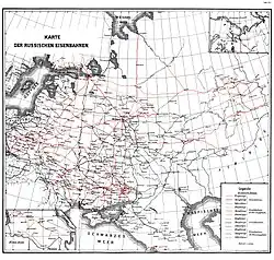 Transport was one of the weak points of the immense Russian Empire. With the Black Sea closed by the Ottomans, imports were channeled to the port of Arkhangelsk on the White Sea, which had the disadvantage of being frozen in winter, and then to the ice-free port of Murmansk. They ensured limited traffic under the threat of German submarines. But the construction of the White Sea Railway was still unfinished at the start of the war: the new line, hastily built by unskilled workers, was single-track, partly made of wooden rails, and weakened by the instability of the frozen ground; it required constant repairs, and trains ran at 10 or 20 km/h.[56] 70,000 prisoners of war, along with 10,000 Russian workers, were employed on the site, whose living conditions anticipated those of the Gulag.[57] The Arkhangelsk railroad, which in 1914 was running barely a dozen small trains a day, managed to handle 2.7 million tons of material in 1916.[58] By 1917, the theoretical capacity of the three main supply routes - Arkhangelsk, Murmansk, and the Trans-Siberian Railway - had risen to 3.5 million tons a year.[58]
