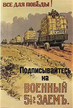 Russia's mobilization rate was low: 10%, compared with 20% in France and Germany. However, the economy was lagging. Aid to the families of mobilized soldiers rose from 191 million rubles in 1914 to 624 million in 1915, plus pensions for widows, orphans, and disabled.[54] The State Bank of the Russian Empire had to print 1.5 billion rubles in the first months of the conflict, and by December 1915, the ruble had already lost 20% of its value.[55] Russia had to borrow from its allies: in October 1915, it received 500 million rubles from the French and 3 billion from the British. In exchange, part of the Russian gold stock, worth 464 million roubles, was sent to the United Kingdom as collateral.[55]