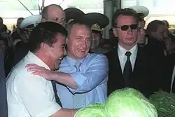 The Russian Bazaar or Gulistan (Turkmen: Gulistan söwda merkezi; Rus bazary, Гулистан сөвда меркези; Рус базары) in Ashgabat is one of the largest and oldest covered markets in the Turkmenistan. It is located in the centre of the city. The "Russian Bazaar" was built in the period of 1972—1982 by the design of the Russian architect Vladimir Visotin among other buildings that were included in the "Ashgabat Reconstruction Program of 1970-1980." The building was done in the Soviet Modernism style and decorated by the Turkmen sculptor Klych Yarmamedov who adored the building with a magnificent abstract sculpture placed in one of the building's corners. Despite the emergence of new stores and malls in Ashgabat, markets continue to be popular among locals and tourists and are regularly visited by foreign delegations. The range of goods is enormous, and the bazaar also houses shops and eateries. In 2001 it was reconstructed by the Turkish company Ekol, with updated outlets, shops and foodstalls.[1] The complex was covered with white marble. In 2007, there was a fire in the clothing section of the market.