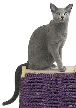 The Russian Blue cat (Russian: Русская голубая кошка, romanized: Russkaya golubaya koshka), commonly referred to as just Russian Blue, is a pedigreed cat breed with solid blue colours that vary from a light shimmering silver to a darker, slate grey. The short, dense coat, which stands out from the body, has been the breed's hallmark for more than a century.
