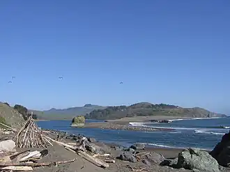 Austin Creek enters from the north before the River passes through Duncans Mills. State Route 1 crosses over the river before it flows into the Pacific Ocean between Jenner and Goat Rock Beach. The Russian River estuary is recognized for protection by the California Bays and Estuaries Policy.[12] The mouth is about 60 mi (100 km) north of the San Francisco Bay's Golden Gate bridge.