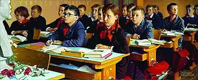 Russian Schoolroom (1967), also known as The Russian Classroom and Russian Schoolchildren, is an oil on canvas painting created by American illustrator Norman Rockwell (1894–1978) and commissioned by Look magazine. It depicts Soviet (presumably Russian) schoolchildren in a classroom with a bust of Soviet leader Vladimir Lenin.