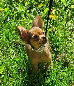 The Russian Toy (also known as the Russian Toy Terrier, and in Russia as the Russkiy Toy, Russian: Русский той) is a very small breed of dog originally bred in Russia from the English Toy Terrier. There are two types of coats in the breed: smooth coat and long coat. The smooth-coated variety was previously known as the Russian Toy Terrier and long-coated as the Moscow Long-Haired Toy Terrier. Both were brought together under the same Russian Toy Terrier name in 1988 and the "Terrier" was dropped from the name when the breed was added in 2006 to the official list of breeds registered with the Fédération Cynologique Internationale.[2] The breed has been registered in the Foundation Stock Service of the American Kennel Club (AKC) since 2008, and has been allowed to compete in AKC companion events since 2010.[2][3] The first official breed standard of the two varieties was written in 1966 in Russia.[2]