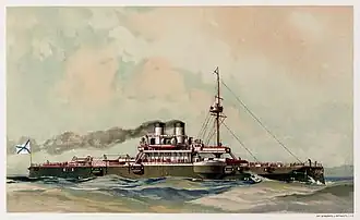 Chesma (Russian: Чесма, also transliterated Tchésma) was the second ship of the Ekaterina II-class battleships built for the Imperial Russian Navy in the 1880s.[1] When the ship was completed she proved to be very overweight which meant that much of her waterline armor belt was submerged.[2] Russian companies could not produce the most advanced armour and machinery desired by the Naval General Staff, so they were imported from the United Kingdom and Belgium. Chesma spent her career as part of the Black Sea Fleet.