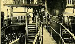 The ships were powered by a pair of vertical triple-expansion steam engines, each driving one propeller shaft, using steam generated by 20 Belleville boilers. The engines were rated at 15,800 indicated horsepower (11,800 kW) and designed to reach a top speed of 18 knots (33 km/h; 21 mph). Knyaz Suvorov, however, only reached a speed of 17.5 knots (32.4 km/h; 20.1 mph) from 15,575 ihp (11,614 kW) during her builder's machinery trials on 9 August 1904. The ships could carry enough coal to give them a range of 2,590 nautical miles (4,800 km; 2,980 mi) at a speed of 10 knots (19 km/h; 12 mph).[4]