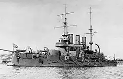 Above the belt was the upper strake of six-inch armour that was 156 feet (47.5 m) long and closed off by six-inch transverse bulkheads fore and aft. The upper casemate protected the six-inch guns and was five inches thick on all sides. The sides of the turrets were ten inches (254 mm) thick and they had a two-inch roof. The conning tower's sides were nine inches thick. The nickel-steel armour deck was two inches thick on the flat amidships, but 2.5 inches (64 mm) thick on the slope connecting it to the armour belt. Fore and aft of the armoured citadel, the deck was three inches (76 mm) to the bow and stern.[4] In 1910–1911, additional one-inch (25 mm) armour plates were added fore and aft; their exact location is unknown, but they were probably used to extend the height of the two-inch armour strake at the ends of the ship.[10]