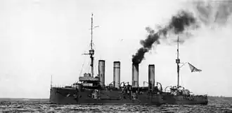 The ship had two vertical triple-expansion steam engines with a designed total of 16,500 indicated horsepower (12,304 kW) intended to propel the cruiser at 21 knots (39 km/h; 24 mph).[2] However, during sea trials, they developed 19,320 indicated horsepower (14,410 kW) and drove the ship to a maximum speed of 22.55 knots (41.76 km/h; 25.95 mph). Steam for the engines was provided by 26 Belleville boilers. She could carry a maximum of 1,100 long tons (1,118 t) of coal, although her range is unknown.[1]