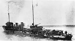 On 26 November 1918, an Allied fleet arrived at Sevastopol, and took control of the Black Sea Fleet ships under the terms of the Armistice, with Bespokoiny coming under French control,[34] and being given the pennant number R.1.[35] The ship was moved to İzmir in April 1919,[5][12] and in September 1919 was transferred to White Russian control as the Russian Civil War continued.[2] In March 1920, Bespokoiny took part in the evacuation of White Russian troops and refugees from Novorossiysk.[36] Following this evacuation, Bespokoiny operated in the Kerch Strait and Sea of Azov, carrying out patrols, escorting food transports and supporting the troops of the Armed Forces of South Russia.[37][35] On 15 September 1920, she was reported[g] as being mined in the Kerch Strait,[2] but received little or no damage and continued operations without disruption.[37][35] On 14 November 1920, Bespokoiny left Sevastopol as part of the final Evacuation of the Crimea, passing via Istanbul to Bizerte where the ship was interned by the French on 29 December 1920. On 29 October 1924, the French government recognised Soviet ownership of the interned ships of Wrangel's fleet, but the ships were not returned and were eventually sold by the Soviets to a French company for scrap, with Bespokoiny being broken up in the early 1930s.[5]