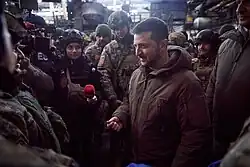 Shortly before the invasion, Russia's proxy forces stepped up attacks on Ukrainian forces and civilians in the Donbas.[105][106] Separatist leaders warned that Ukraine was about to launch an offensive, but they gave no evidence, and The Guardian noted it would be "exceedingly risky" for Ukraine to assault the Donbas while Russian troops were massed on its borders.[106] Ukraine and Western leaders accused Russia of staging false flag attacks and trying to provoke retaliation, to give Russia a pretext for invading.[105][106] On 17 February, Russian proxy forces shelled a kindergarten in Ukrainian-held territory, then blamed it on Ukraine.[106] Zelenskyy said his military would not respond to the provocations.[105]