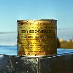 The sea ice began to melt, but the exit from the bay where Zarya spent the winter was still blocked. Toll decided to explore the area in a kayak, accompanied by Seeberg and several sailors. In August they found the mouth of Taymyr River, 100 kilometers further north than shown on their maps. They also managed to recover some of the supplies left at the Gafner Bay.[21] In 1974, a Soviet expedition examined the remaining food at that location and found that oatmeal was perfectly preserved in permafrost after more than 70 years. The expedition decided to continue the food-science experiment inadvertently started by Toll, keeping some of his cans in the original storage conditions and to be reexamined in 1980, 2000 and 2050.[23]